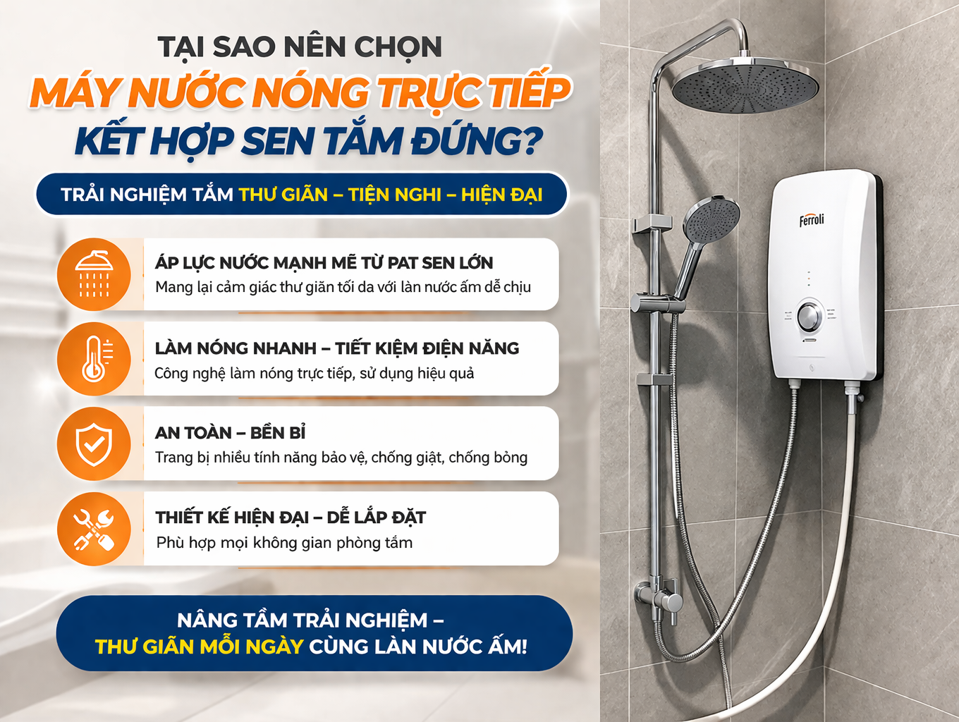 Cuộc sống hiện đại luôn đòi hỏi những giây phút thư giãn đúng nghĩa, và không gì tuyệt vời hơn việc tận hưởng một làn nước ấm ngay tại nhà. Máy Nước Nóng Trực Tiếp Kết Hợp Sen Tắm Đứng mang lại sự kết hợp hoàn hảo giữa công nghệ hiện đại và thiết kế sang trọng, giúp bạn tận hưởng những phút giây thư giãn tuyệt vời như một spa ngay trong phòng tắm của mình.
