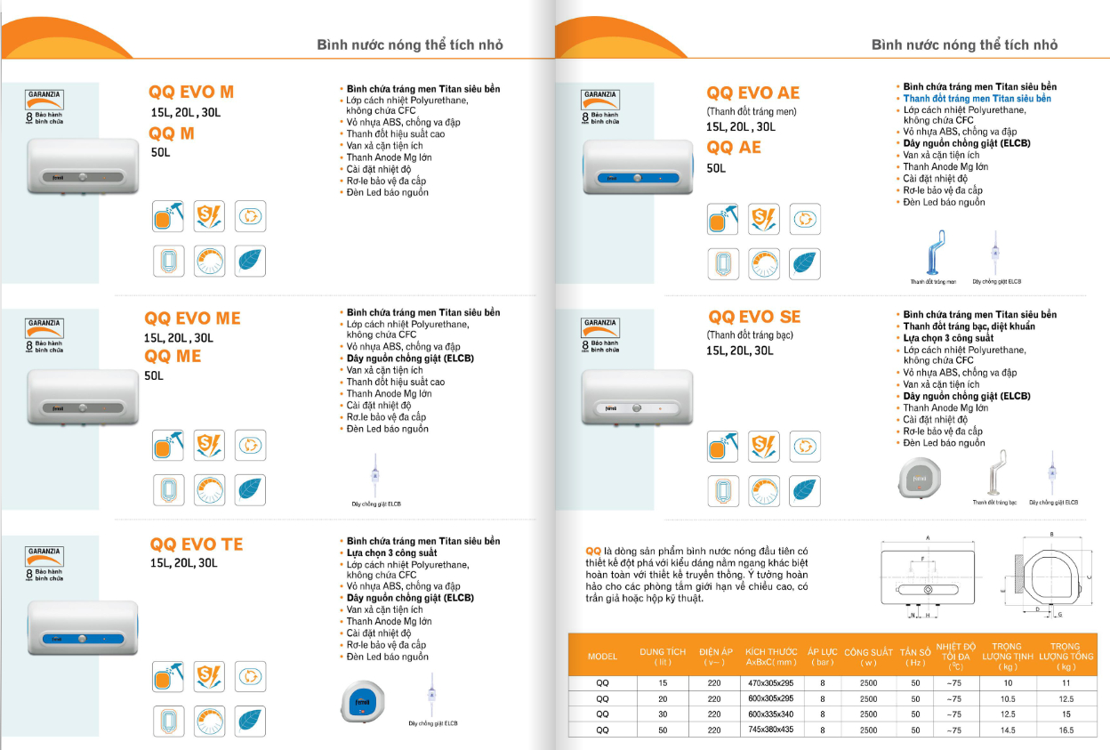 THÔNG SỐ KỸ THUẬT QQME 15L QQME 20L QQME 30L Dung tích (lít) 15 20 30 Công suất (W) 2500 2500 2500 Điện áp (V) 220 220 220 Tần số (Hz) 50 50 50 Nhiệt độ tối đa (°C) 75 75 75 Áp lực nước (MPa) 0.8 0.8 0.8 KÍCH THƯỚC Chiều dài (mm) 470 600 600 Chiều rộng (mm) 305 305 335 Chiều cao (mm) 295 295 340 Trọng lượng (kg) 10 10.5 12.5 ĐẶC ĐIỂM Phương thức lắp đặt Ngang treo tường Ngang treo tường Ngang treo tường Loại máy Gián tiếp Gián tiếp Gián tiếp Lòng bình Tráng men Titan Tráng men Titan Tráng men Titan Vỏ máy Nhựa cao cấp Nhựa cao cấp Nhựa cao cấp Cách nhiệt Foam chất lượng cao Foam chất lượng cao Foam chất lượng cao Thời gian đun nóng ~15 phút ~18 phút ~22 phút TÍNH NĂNG AN TOÀN Cầu dao chống rò điện ELCB ELCB ELCB Bộ ổn định nhiệt TBST TBST TBST Hệ thống chống giật TSS TSS TSS Vỏ chống thấm nước IPX1 IPX1 IPX1 Thanh Magie Chống ăn mòn Chống ăn mòn Chống ăn mòn Van xả cặn Có Có Có Điều chỉnh lưu lượng Có Có Có THÔNG TIN KHÁC Xuất xứ thương hiệu Italia Italia Italia Sản xuất tại Việt Nam Việt Nam Việt Nam Bảo hành lòng bình 8 năm 8 năm 8 năm Bảo hành chung 18 tháng 18 tháng 18 tháng